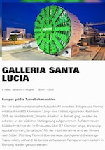 Die viel befahrene italienische Autobahn A1 zwischen Bologna und Florenz erhält auf rund 50 Kilometern Länge eine Entlastungsstrecke. Nachdem 2015 der Nordabschnitt „Variante di Valico“ in Betrieb ging, wurden die Arbeiten an der südlichen Verlängerung aufgenommen. Auf dem neuen Südabschnitt liegt der im Endausbau über 7,7 Kilometer lange, dreispurige Autobahntunnel „Santa Lucia“. Mit der Inbetriebnahme wird der Verkehr nach Süden (Richtung Florenz) über die neue, durchgehend dreispurige Trasse rollen, während die bereits vorhandenen Fahrspuren vom Verkehr in Richtung Norden genutzt werden. [...]